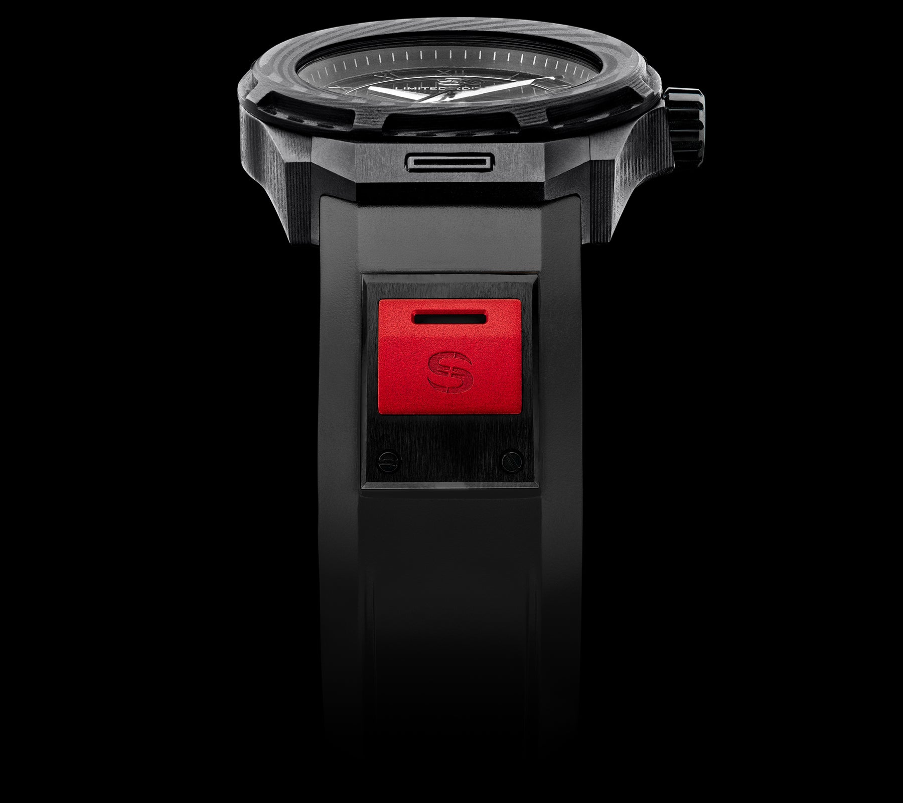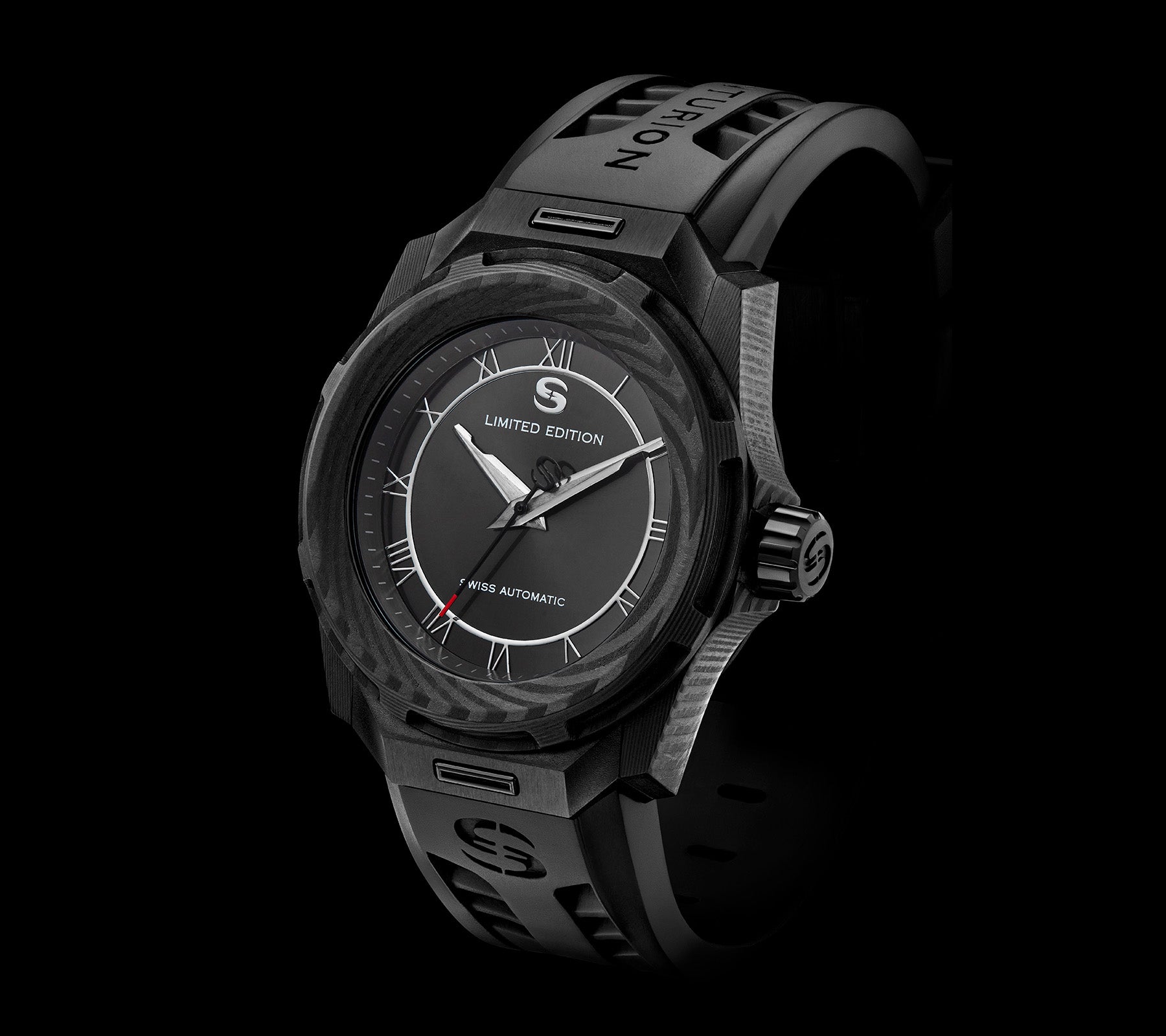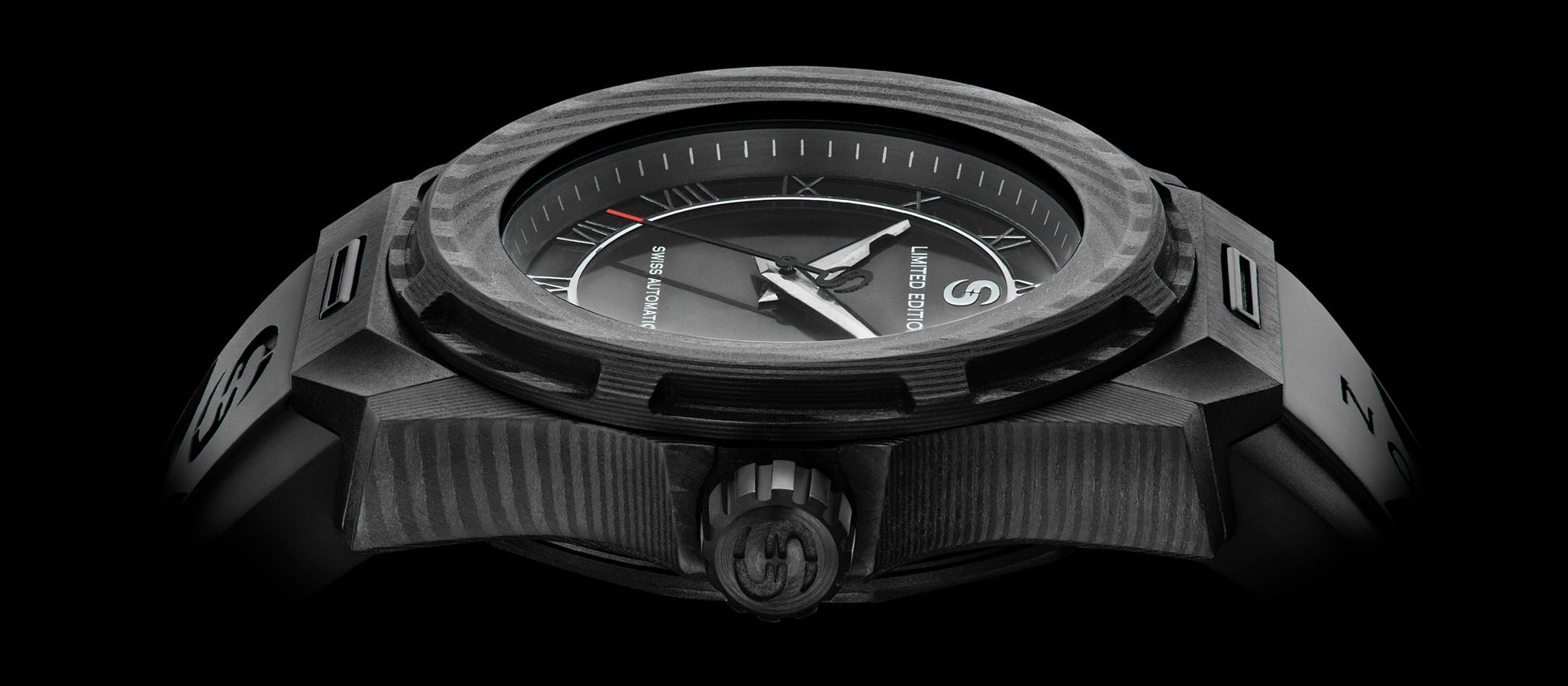 Black Carbon Fibre watch case. Black sunbrush dial. 42 Hour power reserve, Automatic movement. Water resistant to 5 Bar.