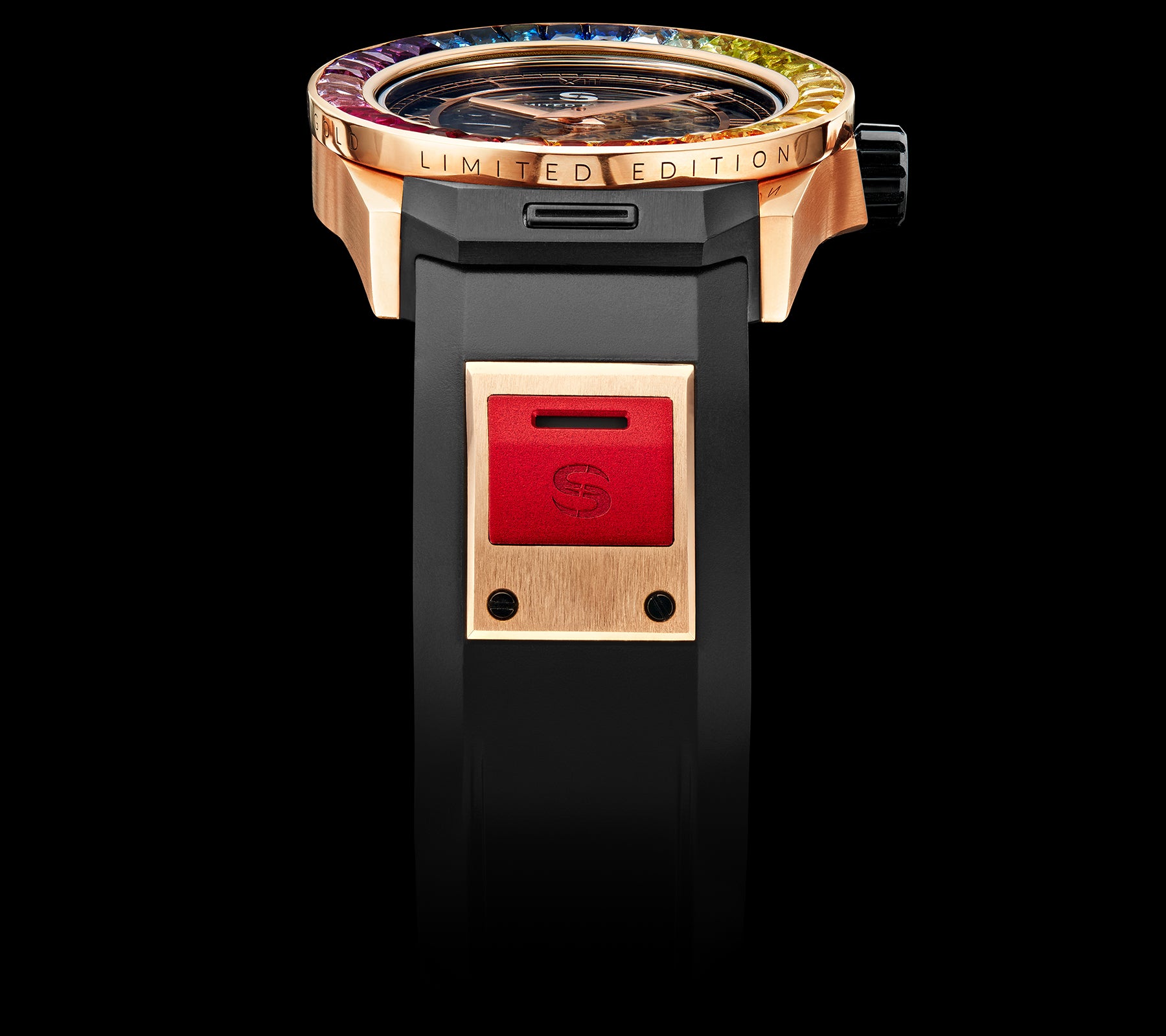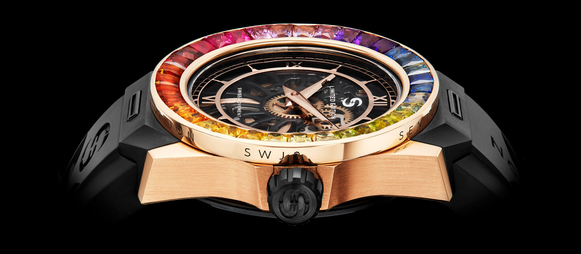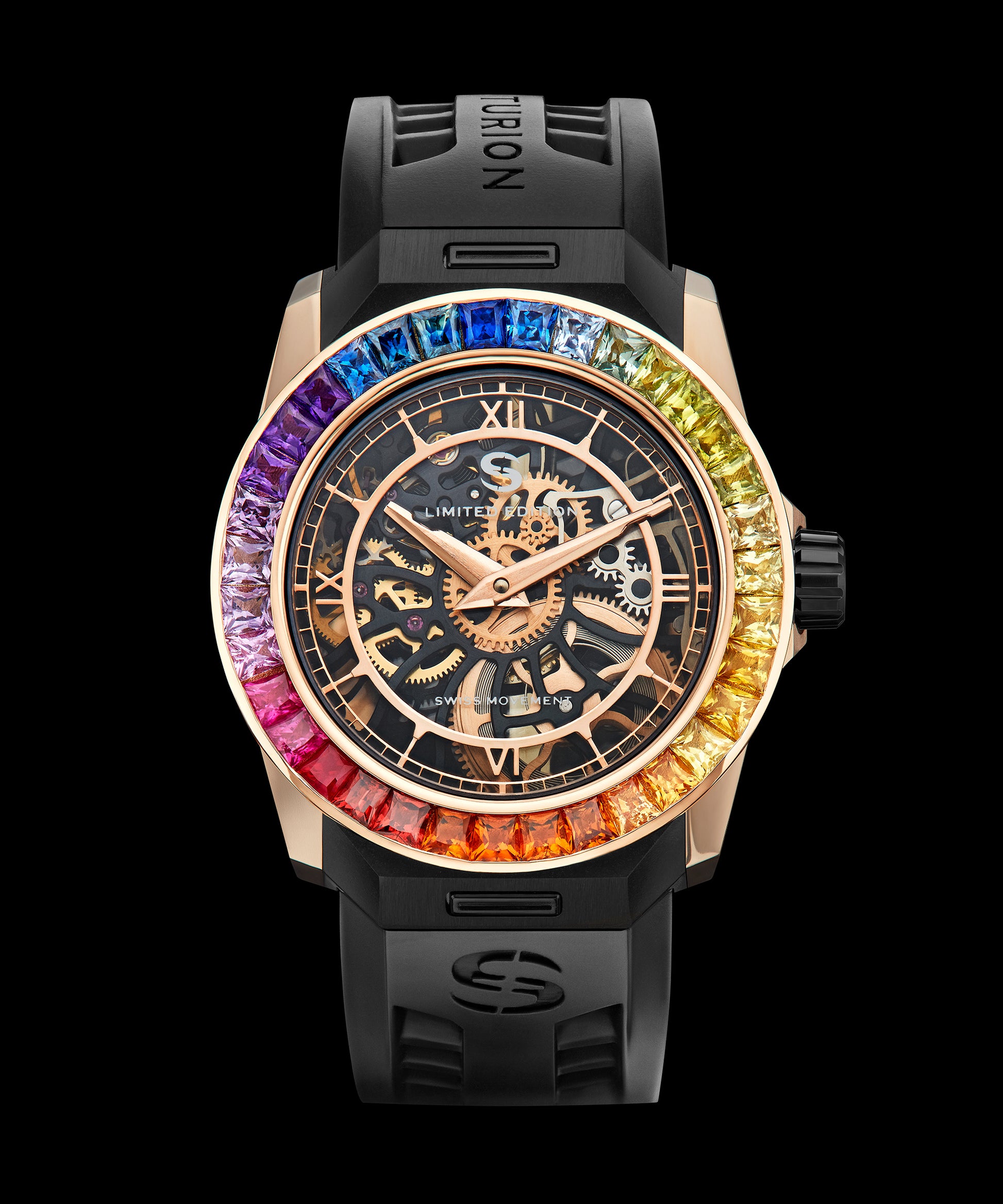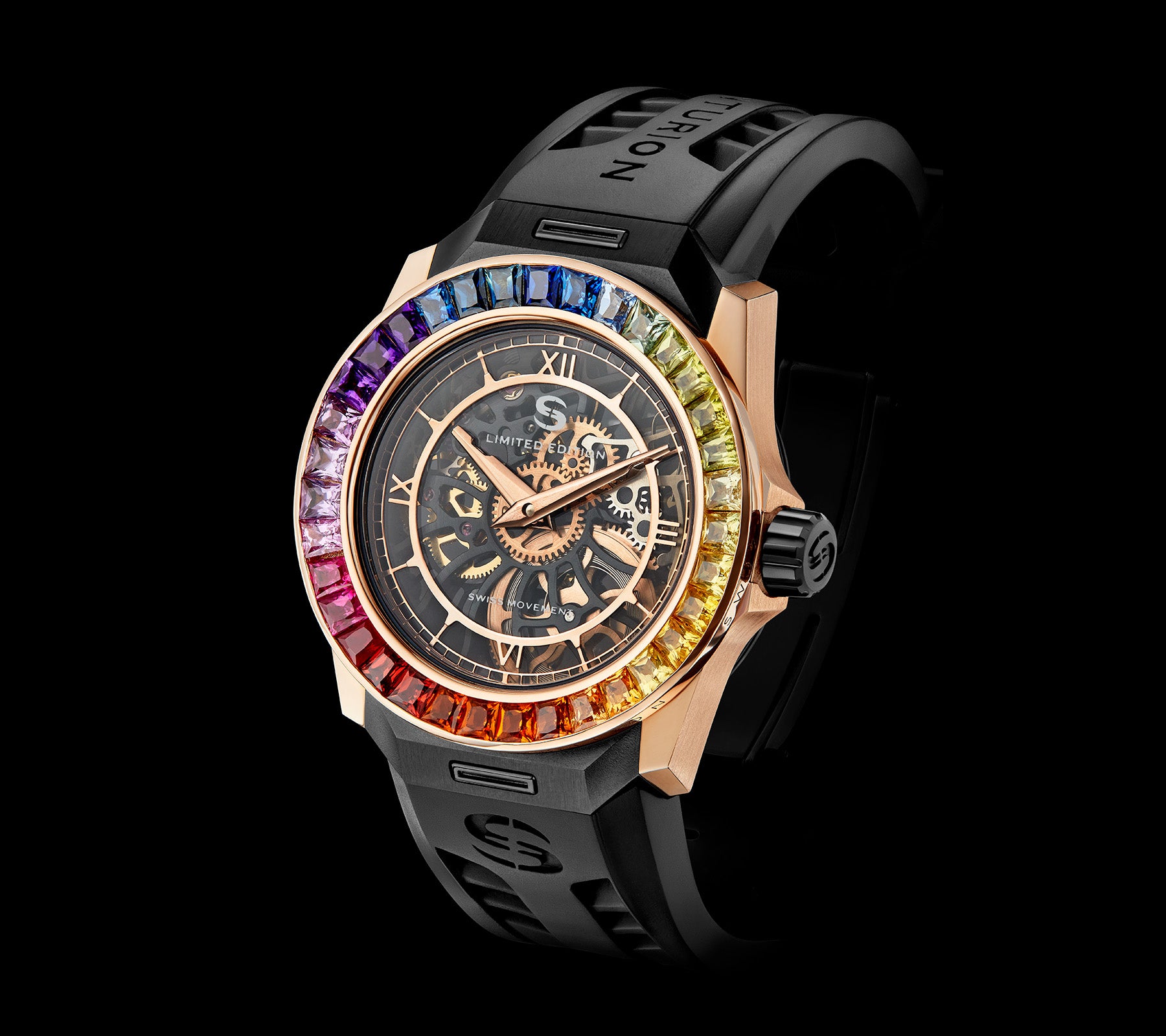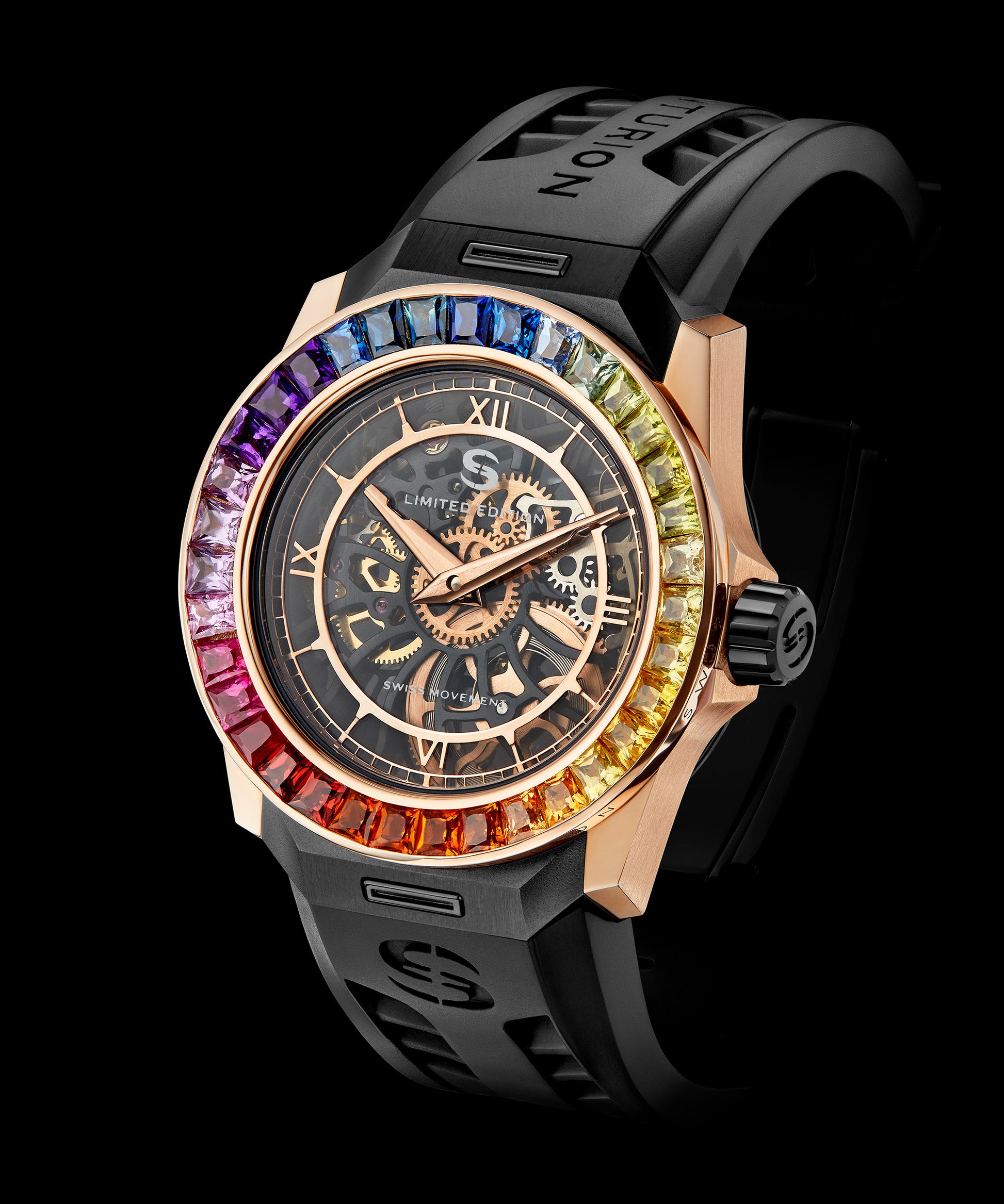 18k Polished Rose Gold watch case with 35 Rainbow Sapphire Bezel. Diamond pave dial. 46 Hour power reserve, Manual wind movement. Water resistant to 5 Bar.