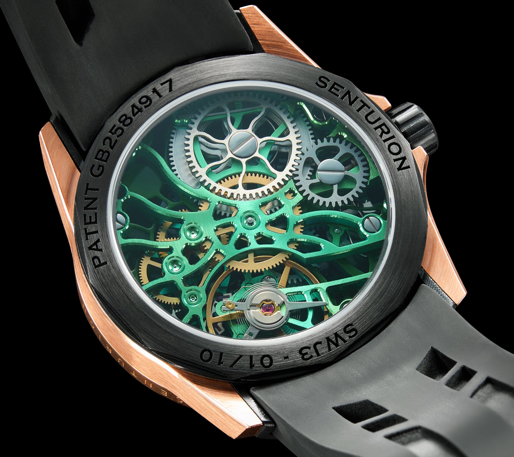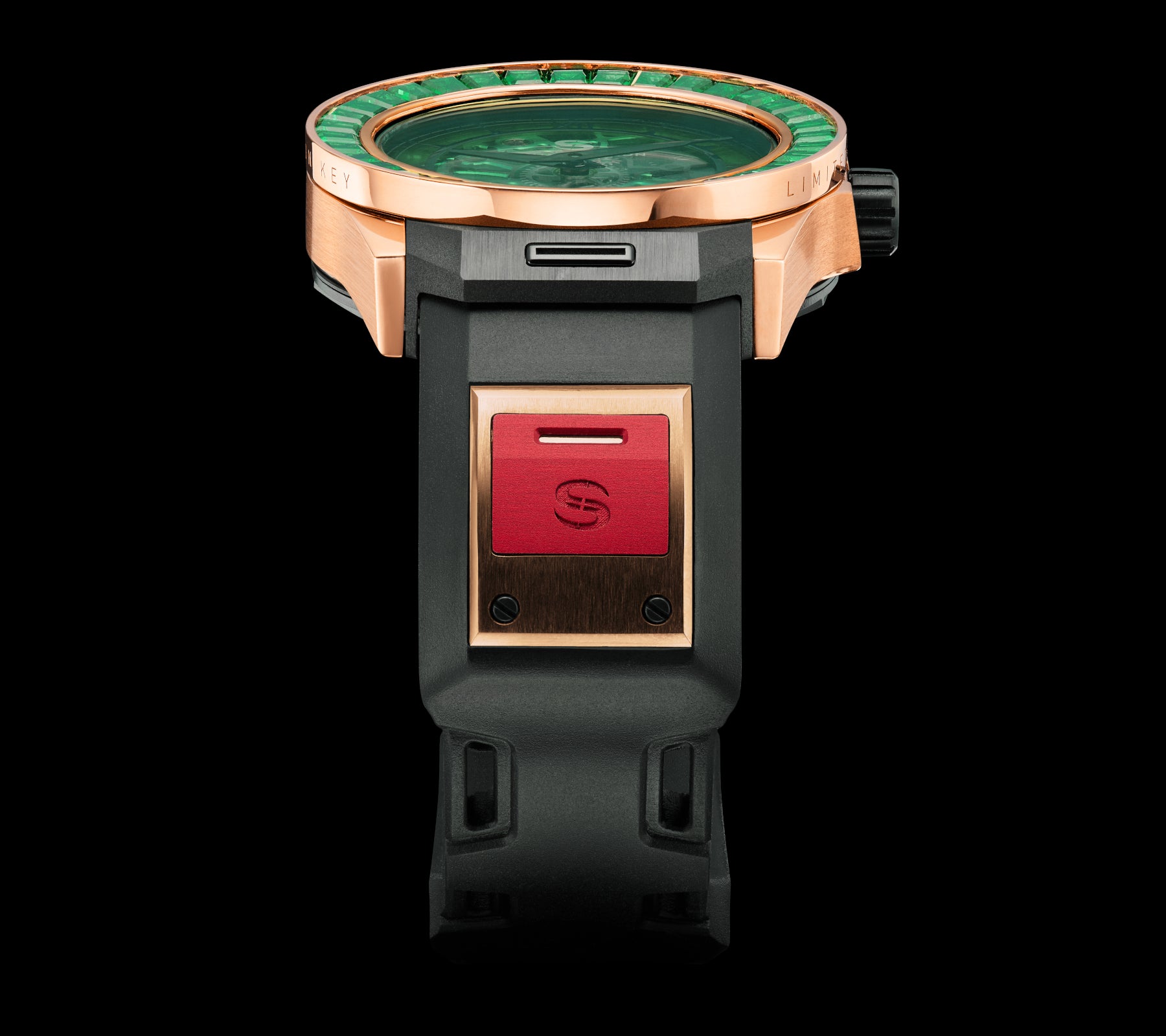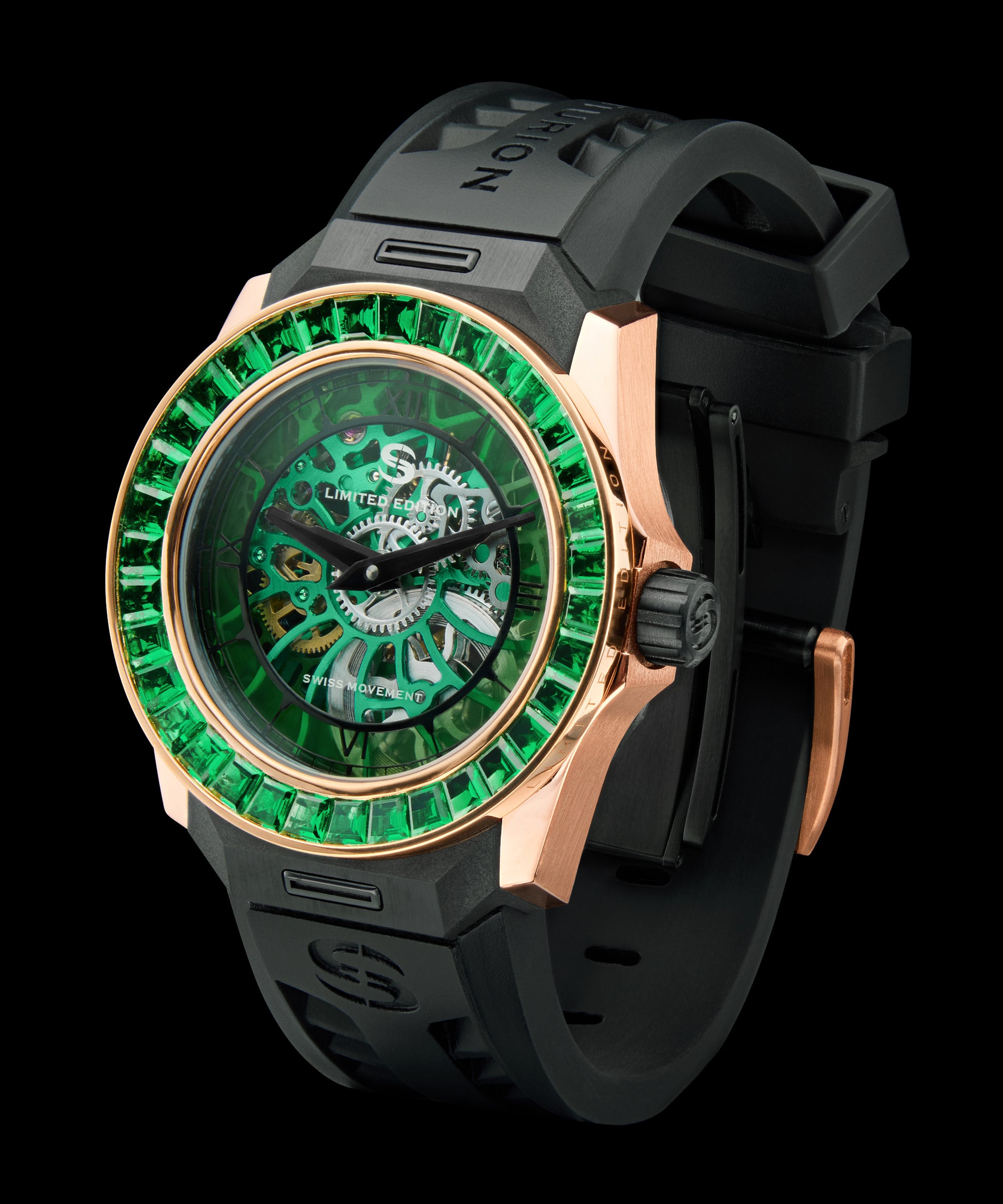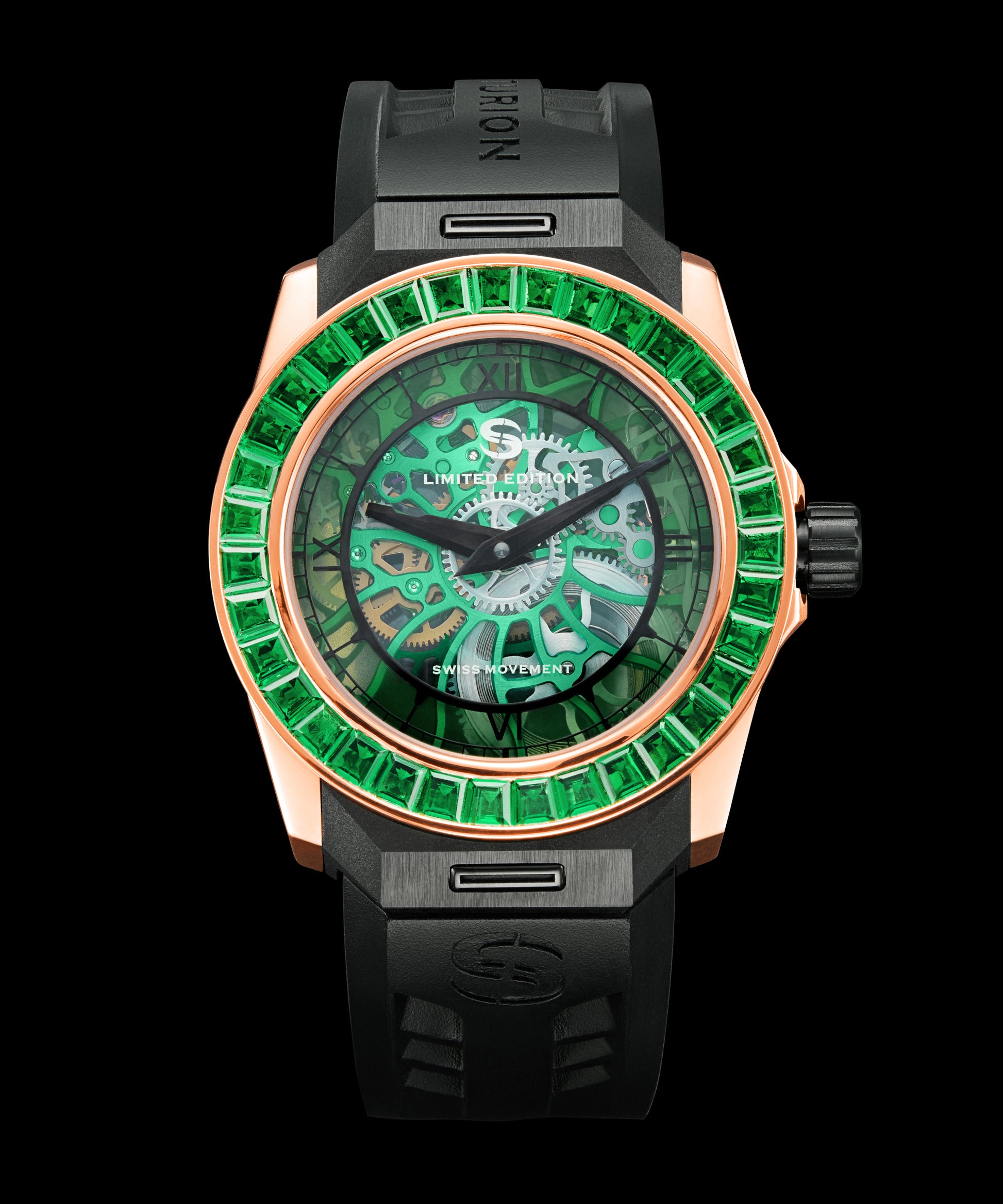 18k Polished Rose Gold watch case with 35 Emerald Bezel. 46 Hour power reserve, Manual wind movement. Water resistant to 5 Bar.